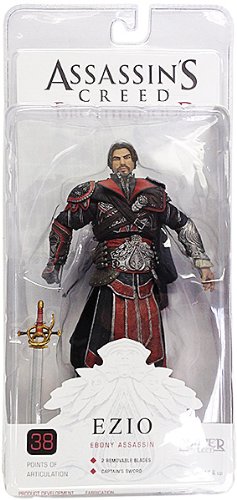 PRODUCT DESCRIPTIONS:New from Assassin's Creed Brotherhood is Ezio unhooded, a Toys R Us Exclusive! This assortment includes Ezio unhooded in ivory and ebony costumes. Ezio unhooded in ivory comes with three sets of interchangeable hands. Ezio unhooded in ebony comes with captain's sword. Both figures stand nearly 7" tall with over 30 points of articulation and features retractable and removable blades on the gauntlets to re-enact Ezio's stealth attacks!