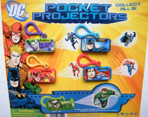 ITEM: This auction listing is for complete mint set of DC COMICS POCKET PROJECTORS. REALLY NIFTY GIZMOS, COME COMPLETE WITH BATTERY. PRESS A BUTTON AND THE GIZMO PROJECTS A LARGE COLORFUL IMAGE OF THE SUPERHERO ON THE WALL. THESE MINI KEYCHAIN/HOOKS ALL HAVE THEIR BRAND NEW BATTERIES (AND THE BATTERIES CAN BE EASILY CHANGED OUT WHEN THEY GET USED UP). FULLY LICENSED DC COLLECTIBLE. SUPERHEROES INCLUDED ARE GREEN LANTERN, THE JOKER, WONDER WOMAN, BATMAN, SUPERMAN, FLASH, AQUAMAN AND BANE. YOU GET ALL 8 AS SHOWN (WHICH IS A COMPLETE SET).