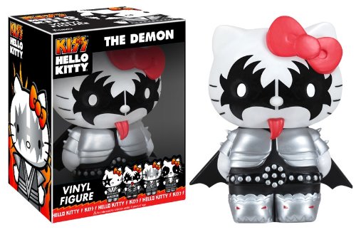 PRODUCT DESCRIPTIONS:Fans of Hello Kitty and KISS, rejoice! It's Sanrio's ever-popular and cute little kitty cat, Hello Kittty, made up to look like Gene Simmons' The Demon from the band KISS, and in adorable Pop! Vinyl form! This Hello Kitty KISS Demon Pop! Vinyl Figure comes complete with The Demon's armor, boots, cape, black face makeup, and wicked tongue; it's one item that lovers of KISS, Hello Kitty, and Pop! Vinyl truly won't want to miss out on. Measures about 5-inches tall.