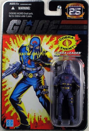 PRODUCT DESCRIPTIONS:Absolute Power! Total control of the world and it's people, wealth, and resources is the objective of Cobra Commander. This fanatical leader rules with an iron fist. He demands total loyalty and allegiance. His main battle plan, for world control, relies on revolution and chaos. He personally led uprisings in the Middle East, Southeast Asia and other trouble spots. Responsible for kidnapping scientists, businessmen and military leaders, than forcing them to reveal their top-level secrets. Celebrate 25 years of the ultimate action team with this articulated Cobra Leader action figure! Display your action figure on the included display base! This Cobra Commander figure comes with a weapon and is one cool anniversary figure for your collection!